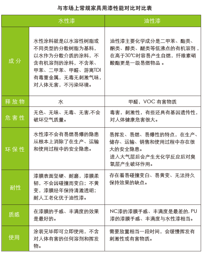 水性漆,顾名思义,是以水作为稀释剂的漆,而这个稀释剂就是它和油性漆最本质的区别。油性漆使用有机溶剂进行稀释,有机溶剂会含有易挥发的化学物质,而且这些化学物质并不会在短时间内全部挥发干净,譬如甲醛,它有可能需要5到10年才能完全挥发干净。这就是现在家具甲醛超标的问题不绝于耳的原因所在。而水性漆以水为稀释剂,不含苯系物、甲醛、游离TDI、有毒重金属,无毒无刺激气味,从根本上杜绝了存在甲醛,在环保方面有绝对的优势。